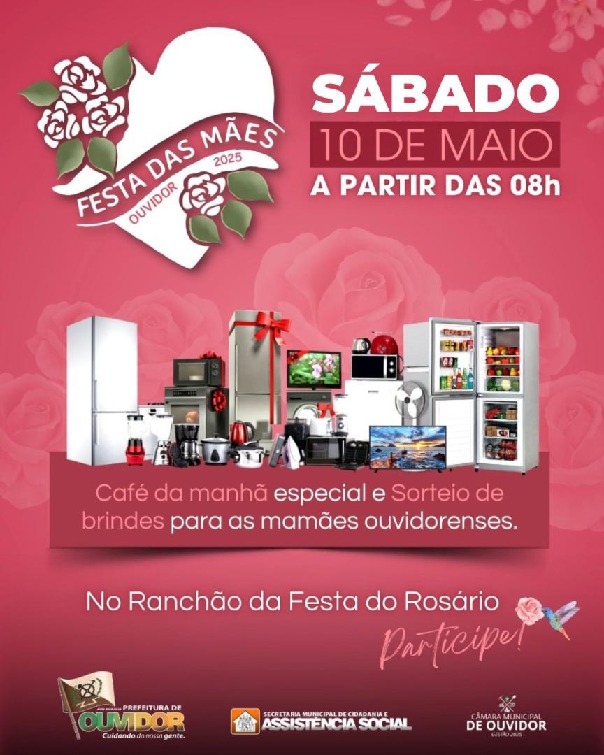 A Prefeitura de Ouvidor, através da Secretaria de Assistência Social, Convidam todas as mamães ouvidorenses para a grande Festa das Mães com um delicioso café da manhã especial e sorteio de vários brindes.