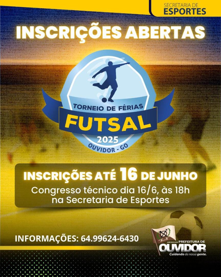 Esporte — A Secretaria de Esportes de Ouvidor informa que já estão abertas as inscrições para o Torneio de Férias de Futsal 2025. Para inscrever seu time procure a Secreraria de Esportes em Ouvidor ou Ligue para: 64.99624-6430 até o dia 16 de junho. O congresso técnico será no dia 16/junho às 18h na Secretaria de Esportes de Ouvidor.